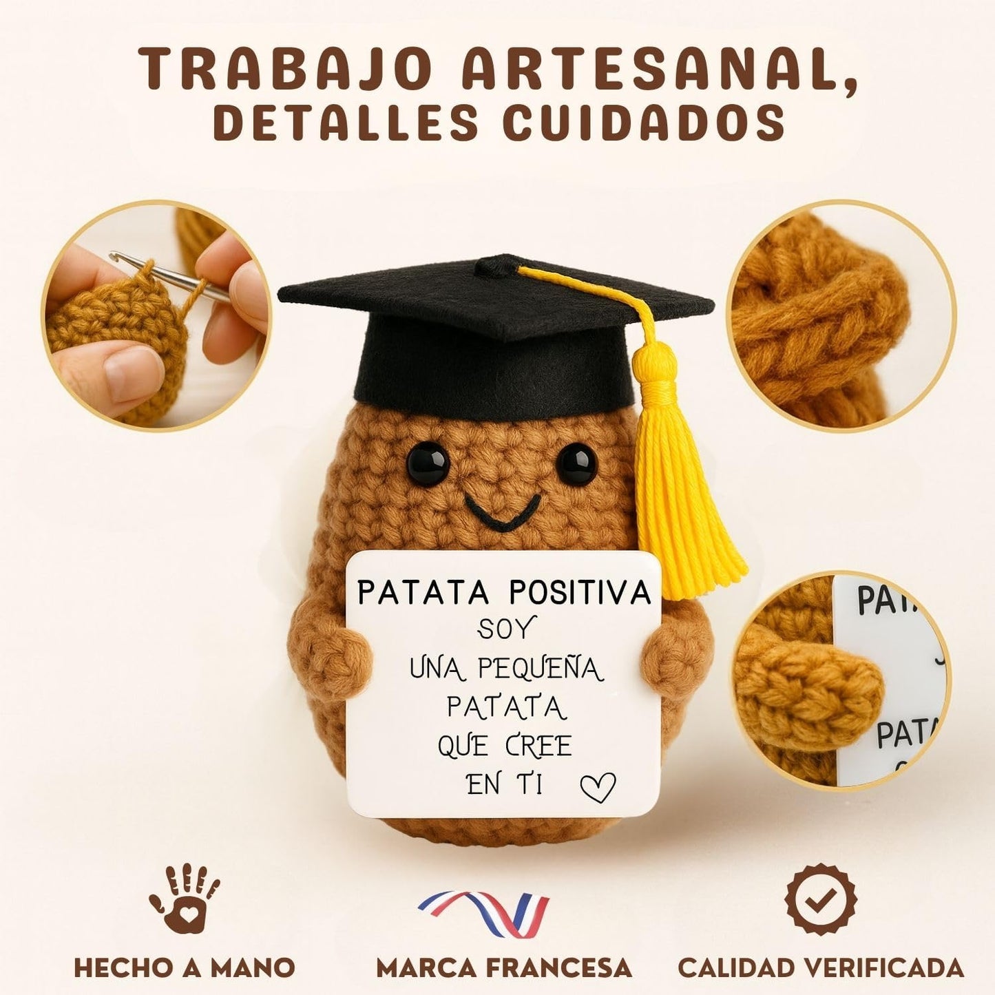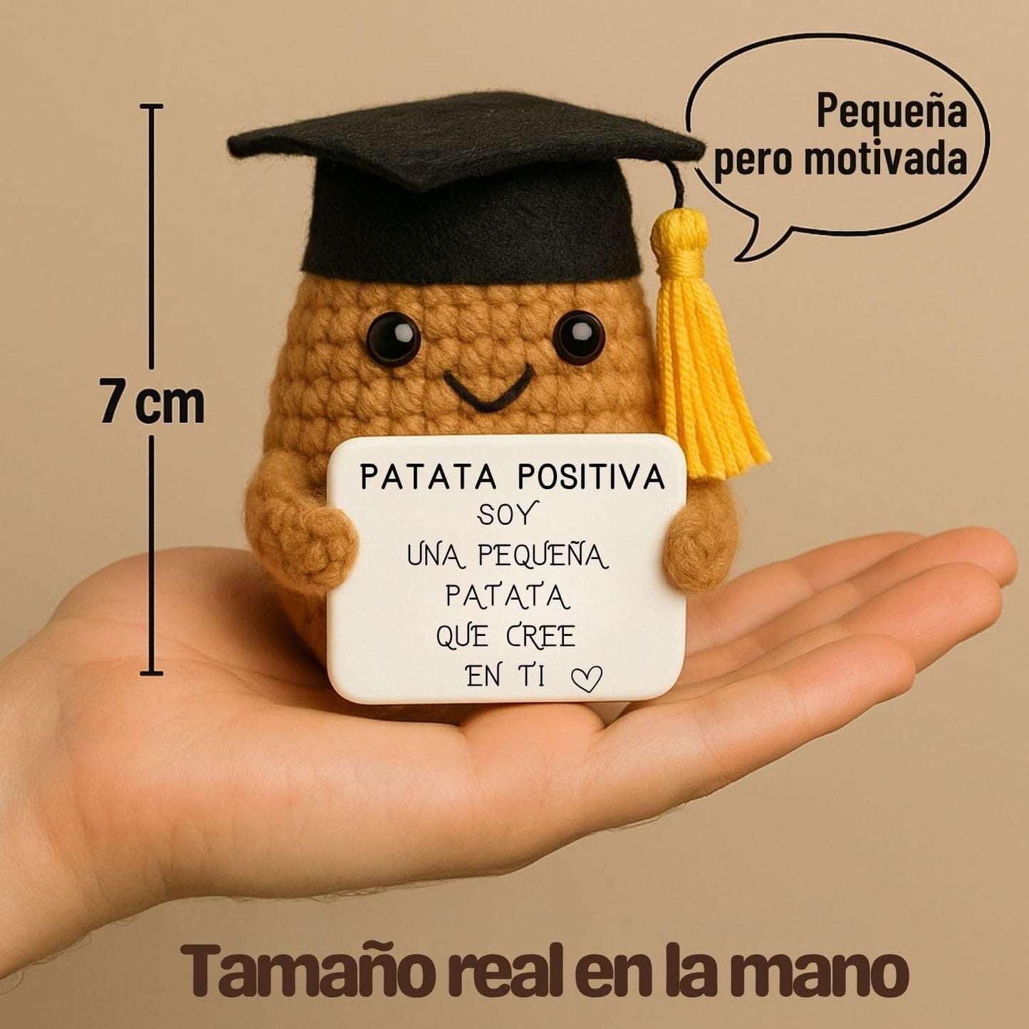 Pour l'instant, chaque Patate Positive mesure 7 cm de tendresse. Elle est petite mais pleine d'amour et de réconfort, cousue à la main juste pour vous !
