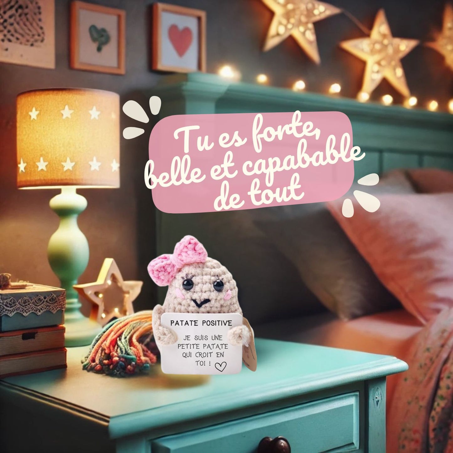 Pour l'instant, chaque Patate Positive mesure 7 cm de tendresse. Elle est petite mais pleine d'amour et de réconfort, cousue à la main juste pour vous !