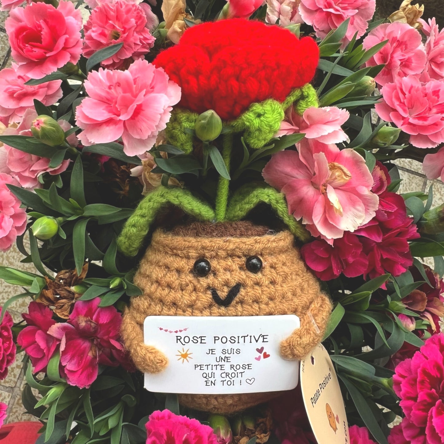 Pour l'instant, chaque Patate Positive mesure 7 cm de tendresse. Elle est petite mais pleine d'amour et de réconfort, cousue à la main juste pour vous !