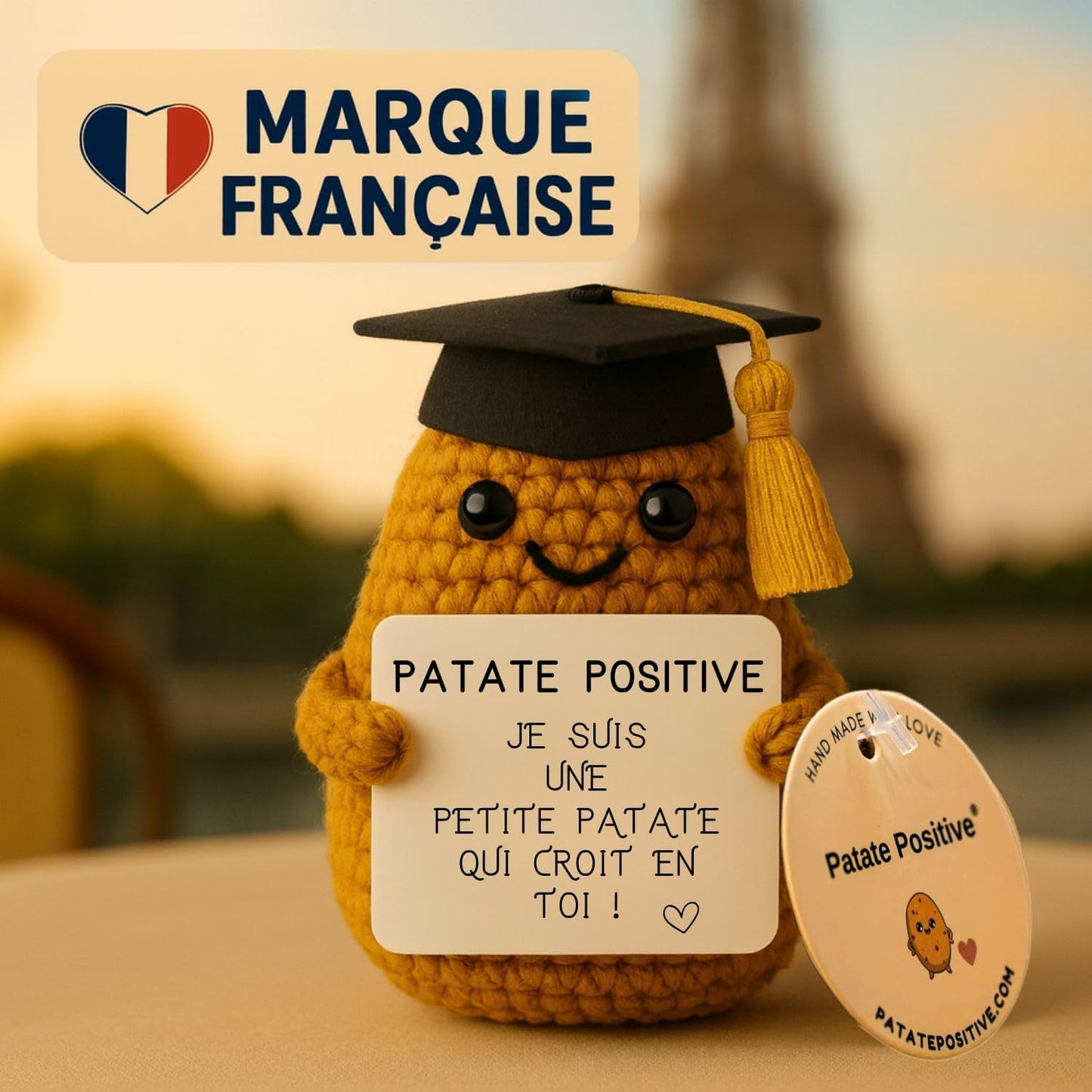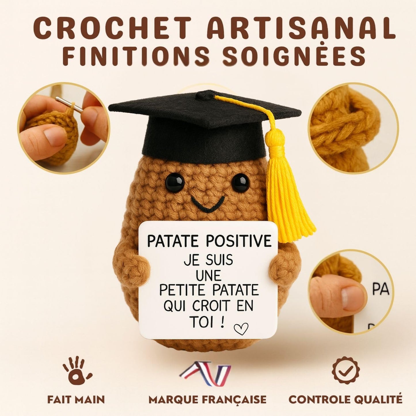 Pour l'instant, chaque Patate Positive mesure 7 cm de tendresse. Elle est petite mais pleine d'amour et de réconfort, cousue à la main juste pour vous !