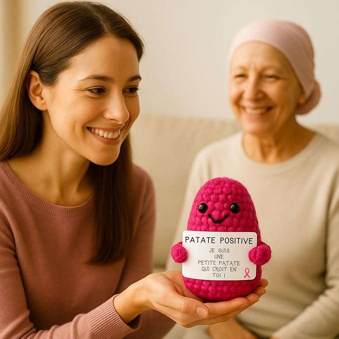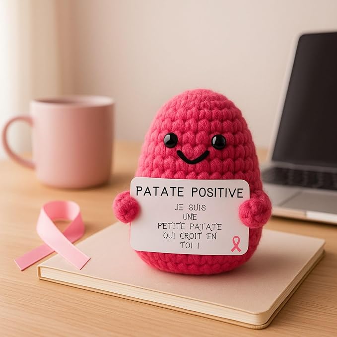 Pour l'instant, chaque Patate Positive mesure 7 cm de tendresse. Elle est petite mais pleine d'amour et de réconfort, cousue à la main juste pour vous !